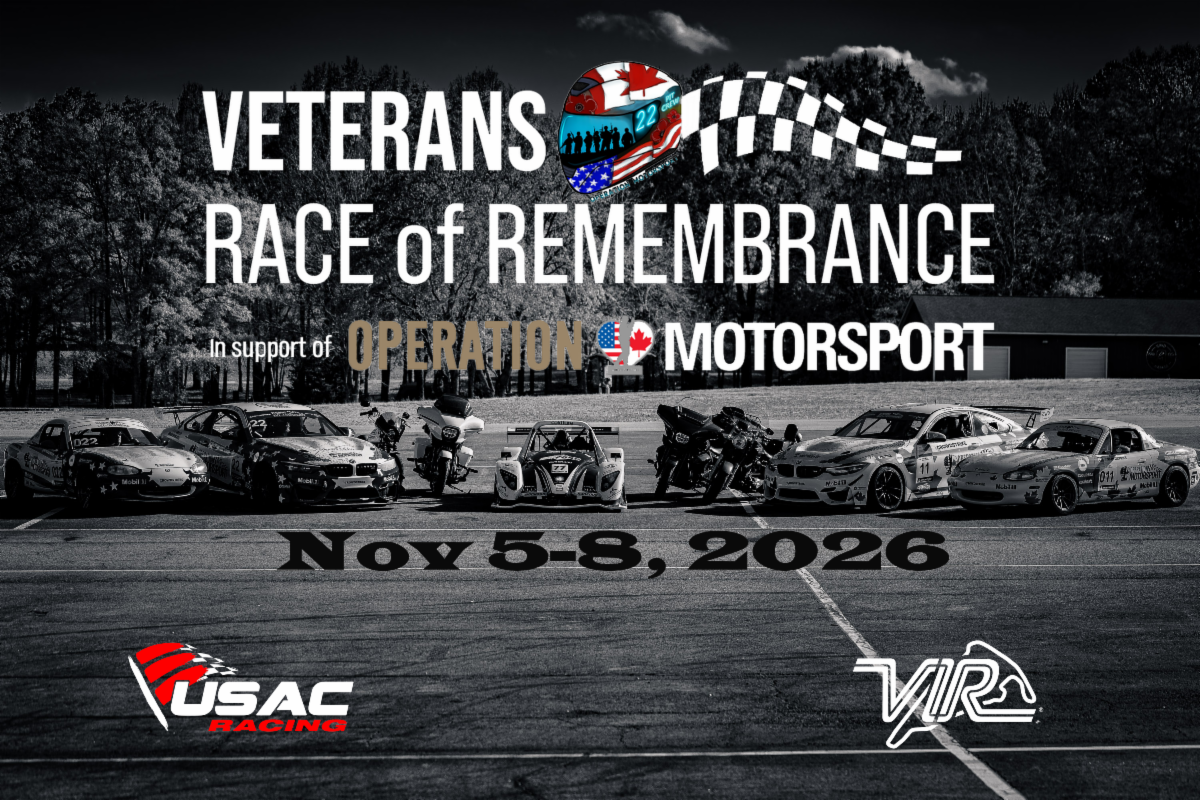 Veterans Race of Remembrance is North America’s only endurance motorsport event dedicated to honoring military service while supporting veteran recovery through competition and community. Held annually over Veterans / Remembrance Day weekend at VIRginia International Raceway and sanctioned by United States Auto Club, the event features multi-class endurance racing, formal remembrance, and immersive veteran participation across teams and race operations. Inspired by the original Race of Remembrance founded by Mission Motorsport, the 2026 running includes an endurance format of eight hours, expanded class structures, and benefits Operation Motorsport.