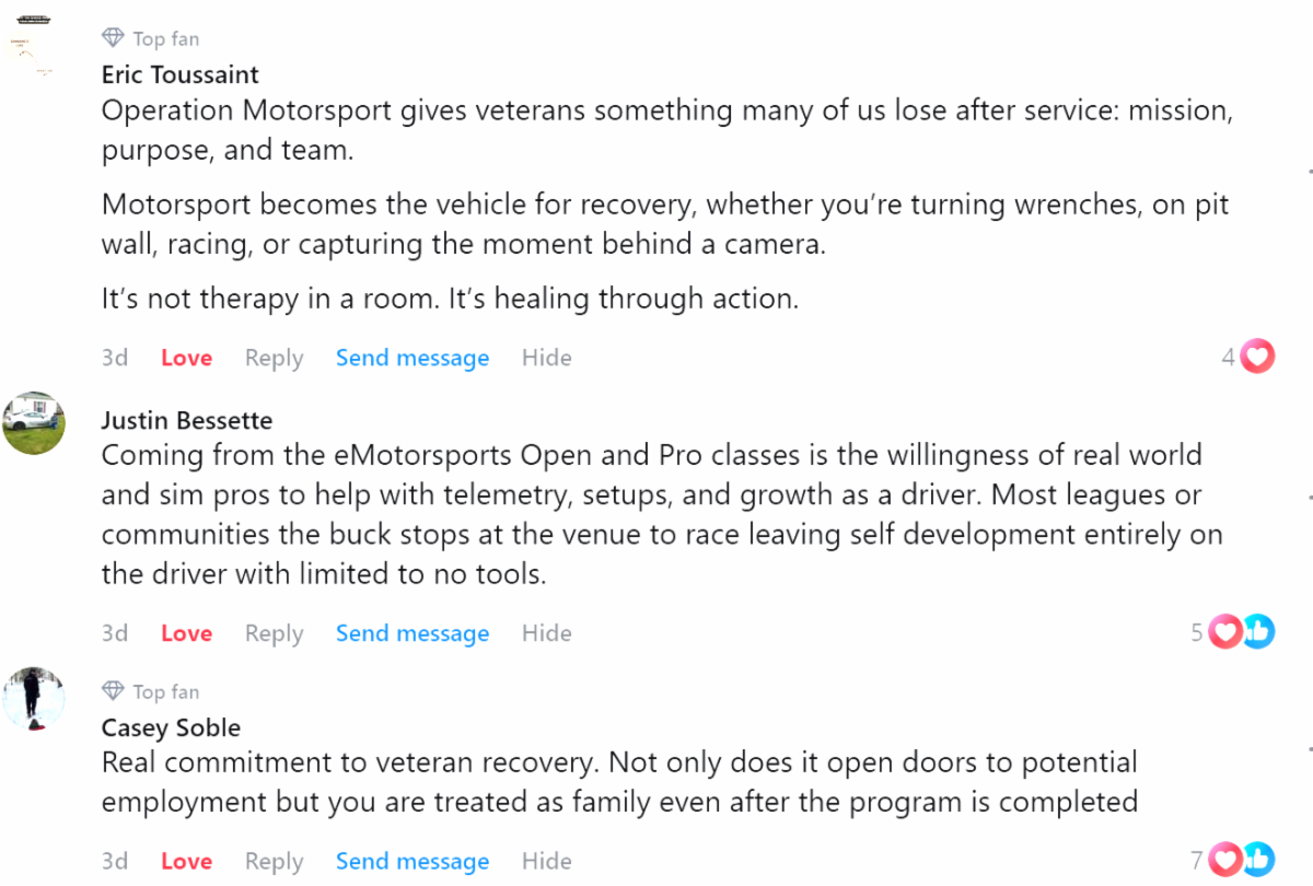 – Eric Toussaint, Operation Motorsport beneficiary (Photography, Operation Motorsport Podcast, Operation eMotorsport League)